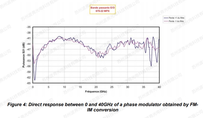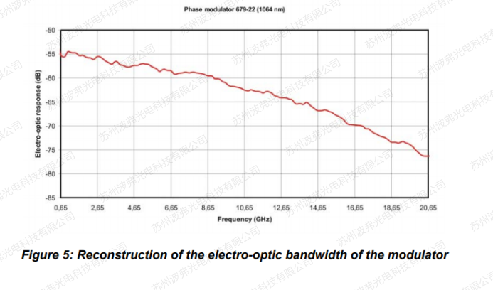 最终产生的强度调制的振幅取决于频率f、滤波器的δf、先前校准过的驱动电压以及要确定的调制器的频率响应。重要的一点是,必须工作在小信号模式以适应信号Vo的振幅。调制器的电光响应S21必须用频率f归一化。频率越高,精度越高。在图5所示的结果上,频率响应高于65MHz。